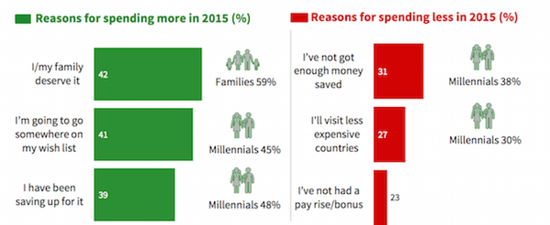 在这份《2015年全球旅游经济报告——3月份旅行指南》中可以看到:2015年,40%的调查对象计划增加旅游预算,其中千禧年游客(millennial traveler:通常指年龄在18~34岁的游客)占50%,而他们中大部分增加预算的原因是为了完成人生清单(bucket list)上列出的地方。其中另有42%的调查对象(包括千禧年游客)提到他们增加旅游预算的理由:为了家庭这么做值得。尤其有大约 60%的印尼家庭旅行者把这个理由作为2015年增加旅游预算的原因。