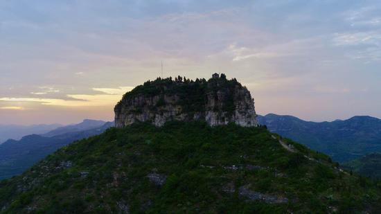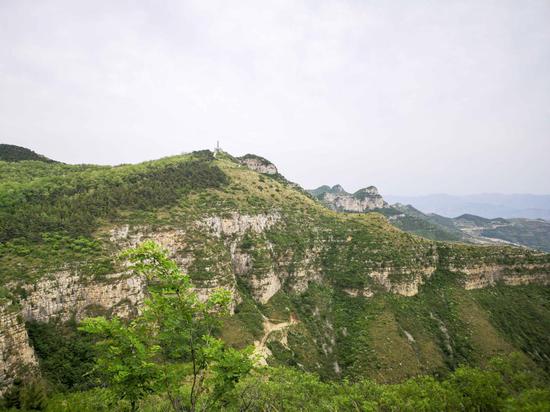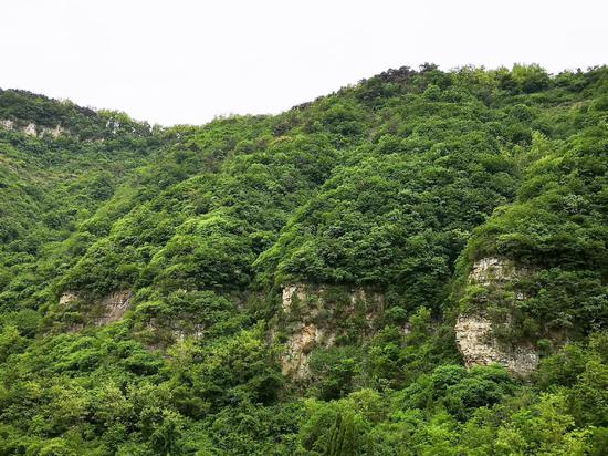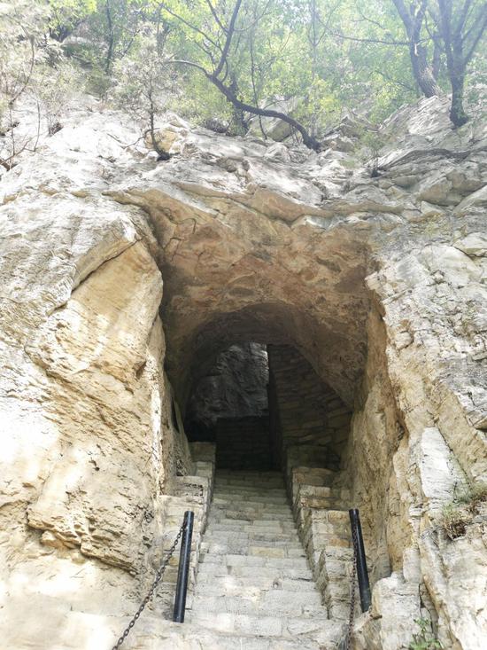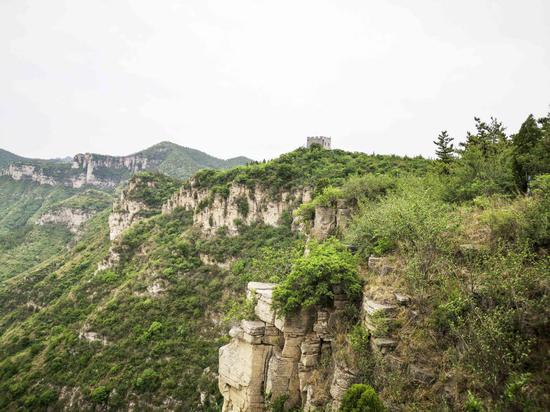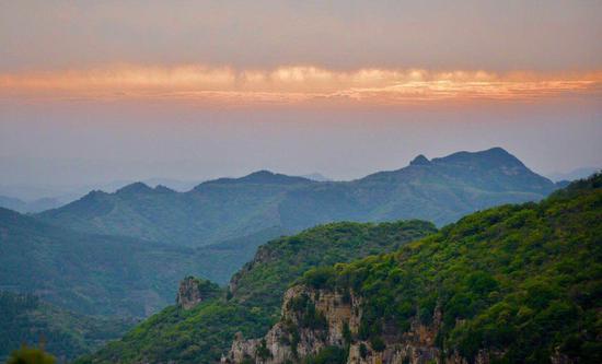把车停在山上的停车场之后,就可徒步山中了。先在索道旁极目远眺,山脉起伏连绵尽收眼底。不一会儿,齐长城就会出现在眼前。齐长城位于景区桃花坡度假村南面,西接淄博,东连临朐,由天然形成的悬崖峭壁构成,以山代墙。