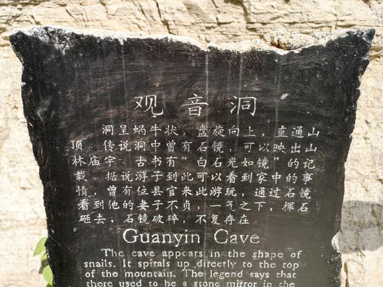 出文殊寺,沿西南而上,到达观音洞,观音洞呈蜗牛状,盘旋而上,直冲山顶。相传洞中有石镜,可映出山林庙宇,古书有“白石光如镜”记载,只是现在,石镜已不复存在,只留给我们无限遐想。观音洞前不远,即是佛光崖,据说曾因放豪光而得名。