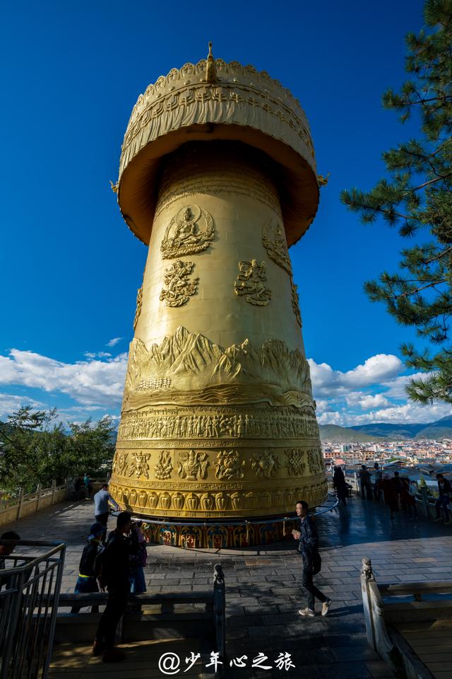 独克宗古城还有世界上第二大转经筒,高21米,总重65吨,筒内装有经咒、无字真言124万条,须4个壮汉方可转动转经筒,每转一周,相当念佛号124万声,一般来这的人,都会顺时针转三圈,祈祷幸福平安。