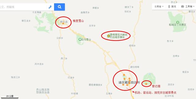 这是香格里拉的景点分布图,梅里雪山距离香格里拉古城开车有200公里,需要近五个小时的时间。香格里拉大峡谷巴拉格宗景区距离古城82公里,开车约一个半小时,可以自驾过去,不过相对比较考验驾驶技术。普达措因为关闭了两个区域,可看性降低。