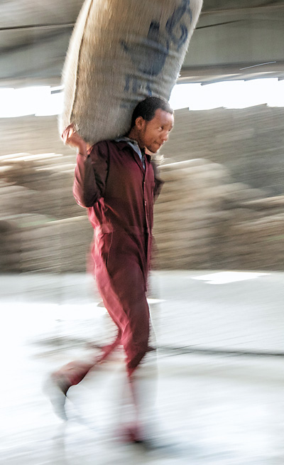 在亚的斯亚贝巴SMS Plc公司的咖啡处理厂,工人正搬运咖啡豆。 |