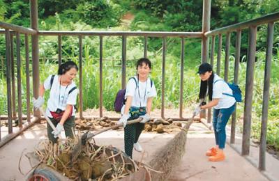 云南省西双版纳傣族自治州野象谷景区,志愿者在打扫象舍。