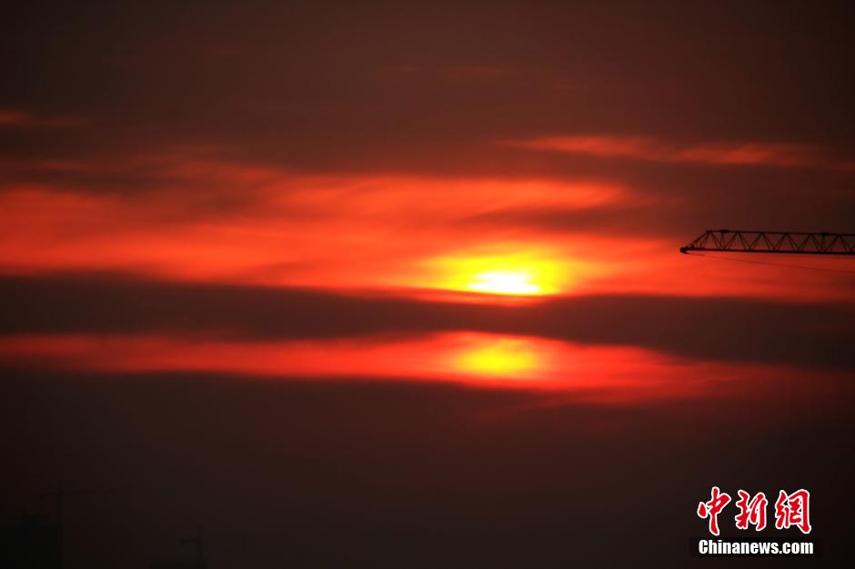 2月6日清晨,河南省郑州市东方出现绚丽朝霞。日出时分,一片乌云似将太阳一分为两半。