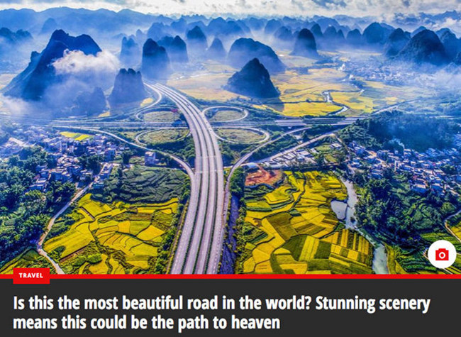 英国《镜报》10月11日以《这是世界上最美的公路?迷人的风景意味着这可能是天堂之路》的标题报道了广西的这条合那高速公路。报道说,这景色看上去就像是在画中,而非现实生活中所拥有的景象。
