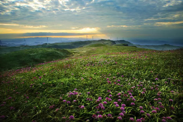 位于威宁、水城、赫章交界处。韭菜坪的韭菜花、日出、云海、怪石、飞瀑流泉等,让人目不暇接、流连忘返。这里海拔2906米,是贵州的,点,有“贵州屋脊’’之称,因而有“不到韭菜坪、枉看贵州山”之说。