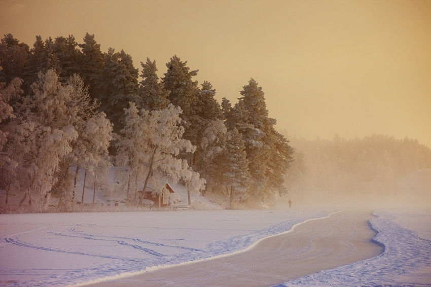 瑞典东约特兰地区看起来就是一个美丽的圣诞场景,冷杉和小木屋环绕着结冰的湖泊。
