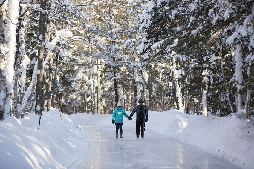 加拿大安大略省的箭头省立公园,这里有许多冰冻的道路,溜冰者可以在这里漫步前行。