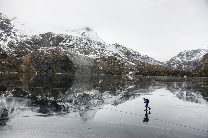 挪威罗浮敦群岛激动人心的风景,一位溜冰者在冰上滑行,冰面清楚地倒映了山脉的画面。
