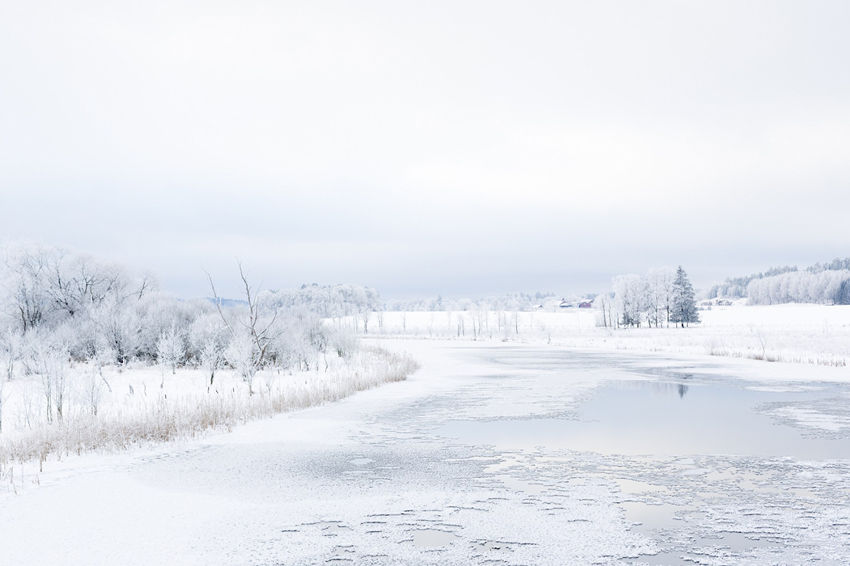 在冬天,瑞典东约特兰地区一个冰冻的湖泊在荒野中蜿蜒向前。