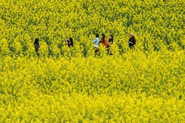 来到这里,你可以沿着连绵的盘山公路徒步向上,从山脚下开始,每个角度的油菜花都可圈可点。