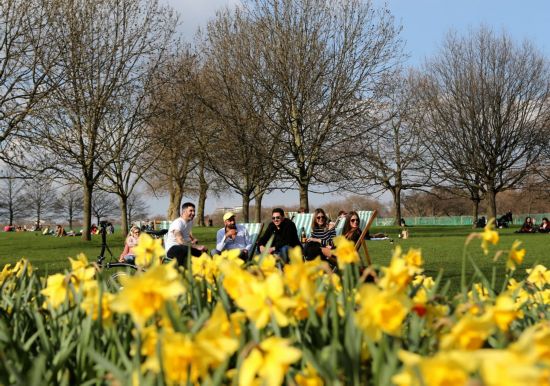 4月7日,人们在英国伦敦市中心公园内享受春光。新华社记者 韩岩 摄