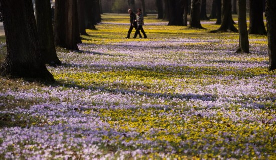 3月9日,在德国东部城市德累斯顿,行人穿过早春开满鲜花的草地。新华社/法新