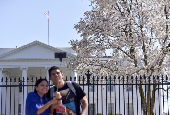 4月6日,在美国首都华盛顿,游客在,的玉兰花前合影。新华社记者 殷博古 摄
