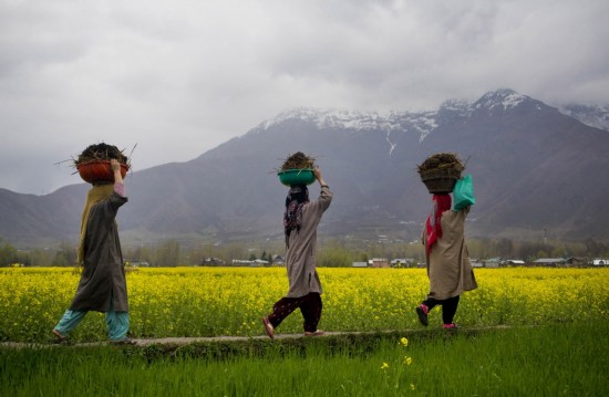 4月4日,在印控克什米尔,斯里那加郊外,当地妇女头顶牛粪走在油菜花田边。新华社/美联