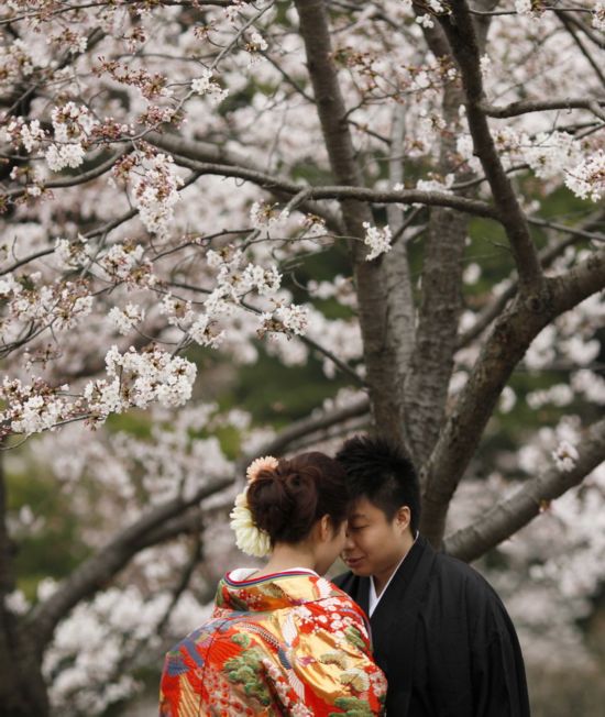 3月29日,在日本横滨,一对情侣在樱花树下拍摄婚纱照。新华社/美联