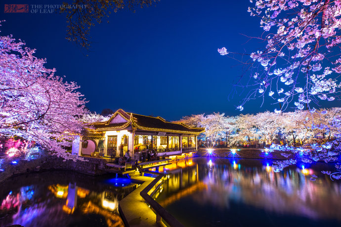 夜色下的鼋头渚灯光璀璨,展现出的是另一番独特的美,白色的樱花在五颜六色灯光照射下,呈现出不同的色彩。古建、石桥、湖面、樱花在灯光的装饰下变得如梦如幻。