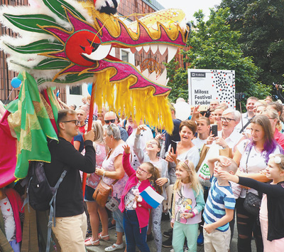 本报华沙6月4日电 (记者于洋)6月3日,波兰南部历史名城克拉科夫市迎来了一年一度的“游龙节”。今年克拉科夫雅盖隆大学孔子学院的“中国龙”作为特邀嘉宾参加该场盛会。在“游龙节”上伴随着鼓声,“中国龙”走在队伍的前面,一亮相便引来观众阵阵欢呼(见上图,于洋摄)。