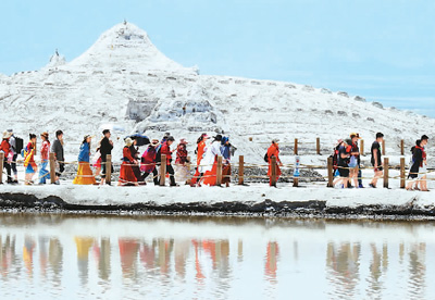 众多游客在青海茶卡盐湖休闲游玩。 |