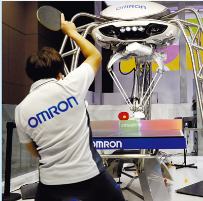 工作人员在欧姆龙展台与机器人打乒乓球。 |