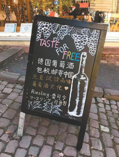德国法兰克福,当地葡萄酒商推出了中文广告牌。 |