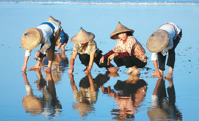 图为赶海的村姑正在海边采挖文蛤等海产。 |