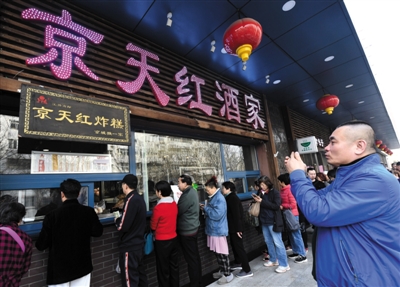 撤离虎坊桥不到三个月,京天红酒家新店昨天在离老店500多米的清华池一楼开业。记者在新店看到,昨日一早,炸糕窗口就已经有市民排队,10点钟,窗口已经排了30多位顾客。