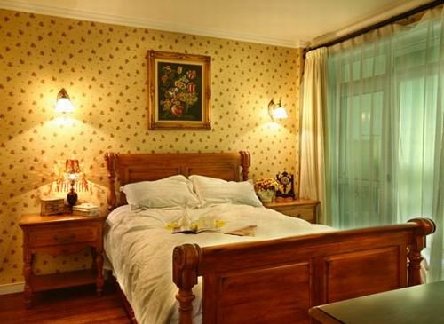 温馨的主卧来啦,墙壁还是以墙纸为主,黄色系的墙纸更温馨,背景墙油画是学画画的朋友送的,与我们家的田园风格相符!卧室纱帘后是另外一个阳台!