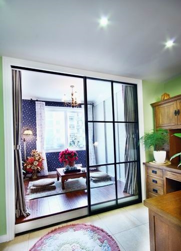 从书房看地台,原来的小房间变成了和室,做了玻璃移门,也可以做一个次卧,所以移门里做也安装了窗帘,拉起来帘子就是一个独立的私人空间!同时我们也计划在将来这里变成儿童房!我觉得小孩子其实更喜欢有趣味的房间,这样的设计也希望将来我们的宝宝也会喜欢!和室的一面墙壁统统做成了衣柜,所以这个房间现在的功能十分强大:和室、客卧、衣帽间!