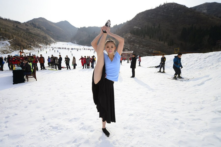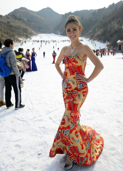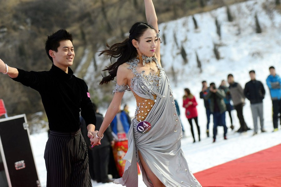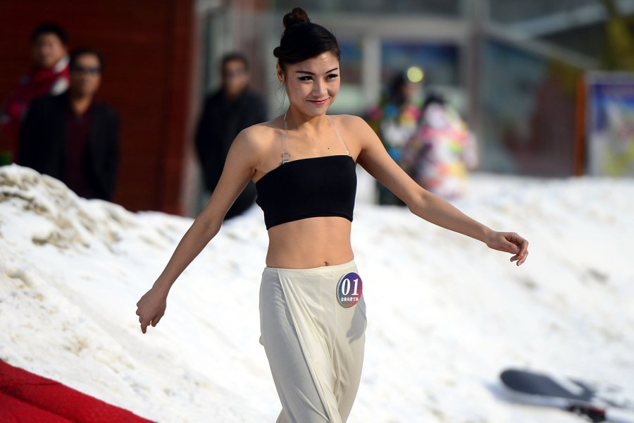 2013年12月15日,山东省济南市一滑雪场举行冰雪美人选秀活动,舞台设立在冰天雪地的山区中,平均年龄19岁的17位少女在零下6摄氏度的低温天气中展示才艺。虽然是寒冬时节,但选手们都选择穿着夏季演出服,短袖、短裙甚至露背装激情表演,美丽又“冻”人。图为选手展示才艺。