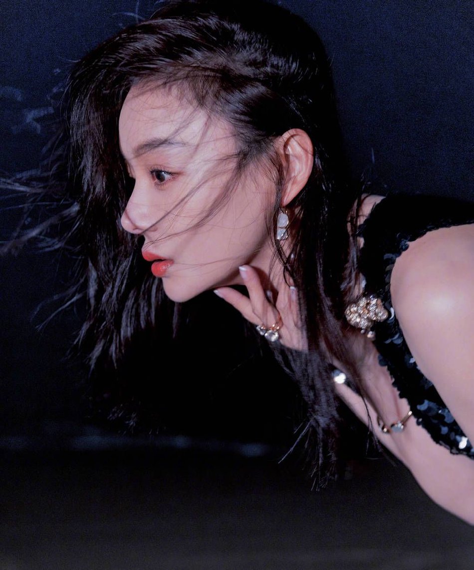 袁姗姗漫步海边楚楚动人 穿深V亮片裙秀窈窕曲线